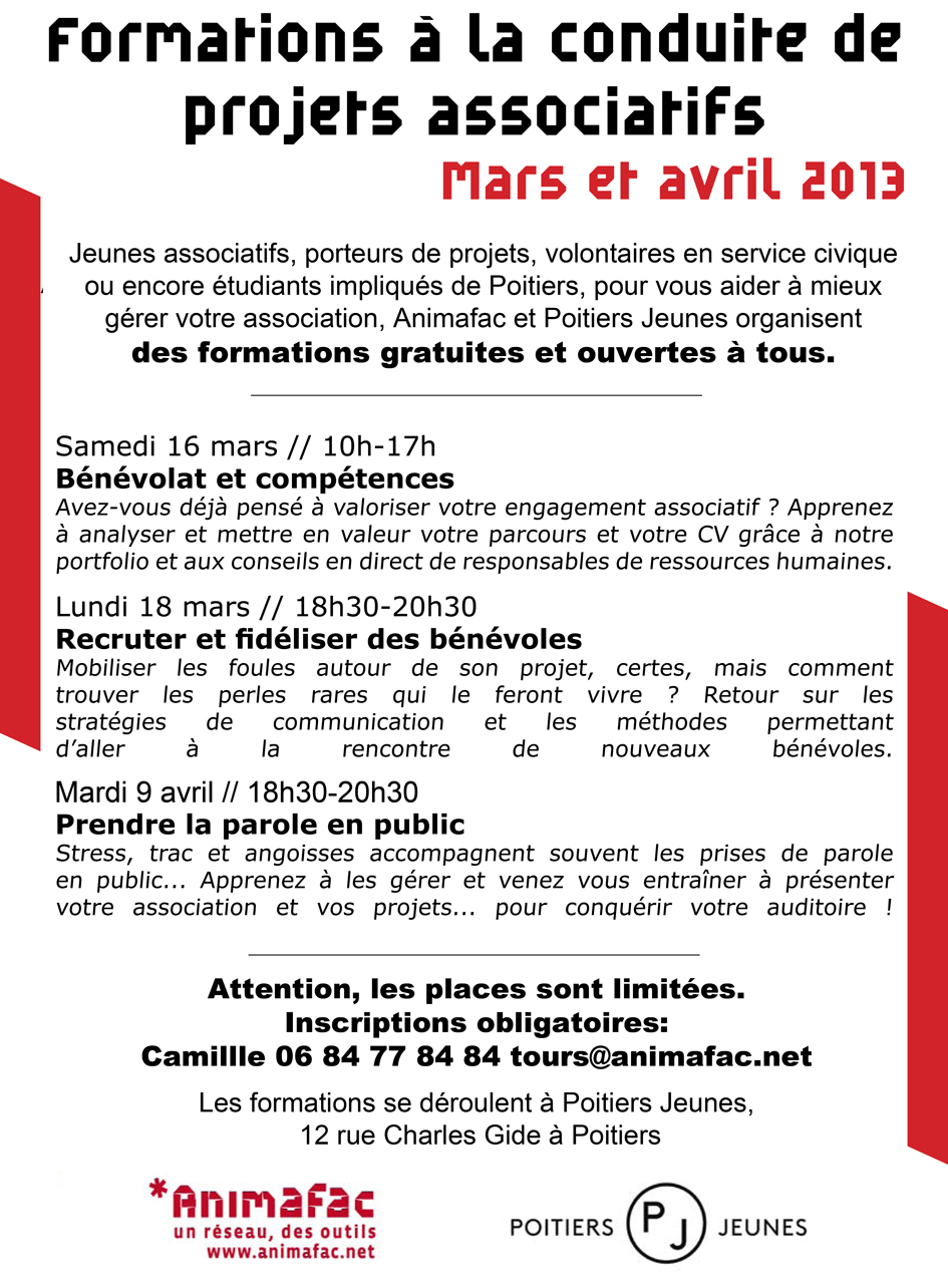 Les formations sont gratuites et les inscriptions obligatoires: Camille 06-84-77-84-84 tours@animafac.net ou le lien suivant