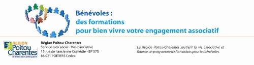 Le nouveau dispositif régional de formations des bénévoles en Poitou-Charentes démarre ! Ce dispositif de formations des bénévoles est proposé et financé par la Région Poitou-Charentes. Il sera mis en œuvre jusqu’en mars 2013. Un autre catalogue de formations de septembre 2012 à mars 2013 sera disponible prochainement. Toutes les formations sont gratuites.